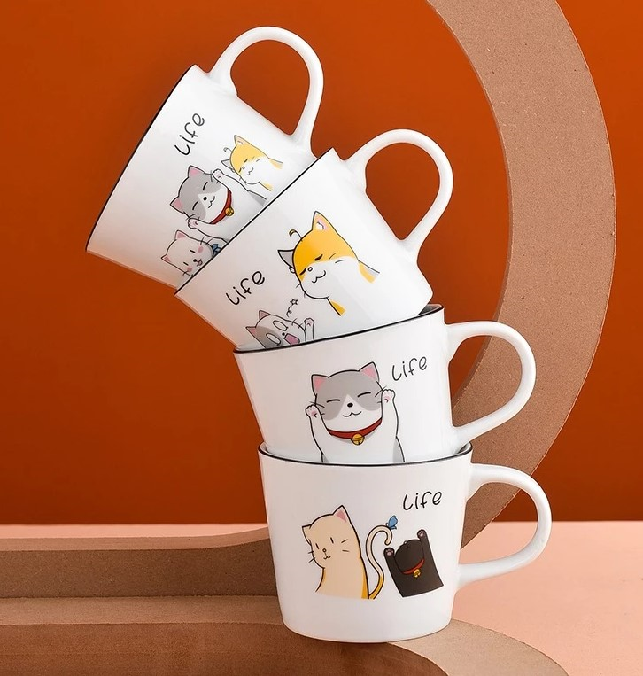 Cốc trà, cà phê, gốm sứ kèm thìa in họa tiết mèo hoạt hình dể thương
