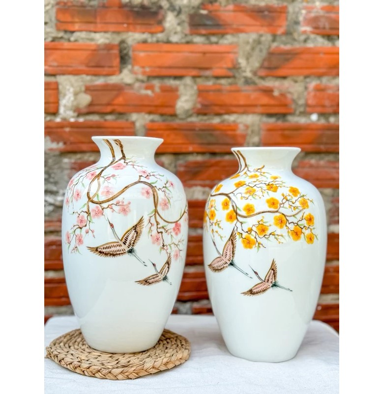 Lọ Hoa Dáng Lộc Bình Men Bóng Trắng Vẽ Tay Mai Hạc - Đào Hạc trang trí Tết