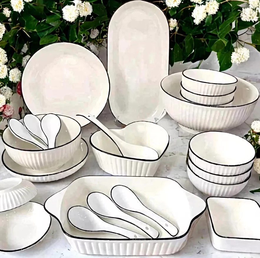 Bộ bát đĩa sứ cao cấp với họa tiết đơn giản và viền đen sang trọng, mang đến sự tinh tế cho bữa ăn của bạn. Chất liệu sứ cao cấp đảm bảo độ bền và vẻ đẹp lâu dài.