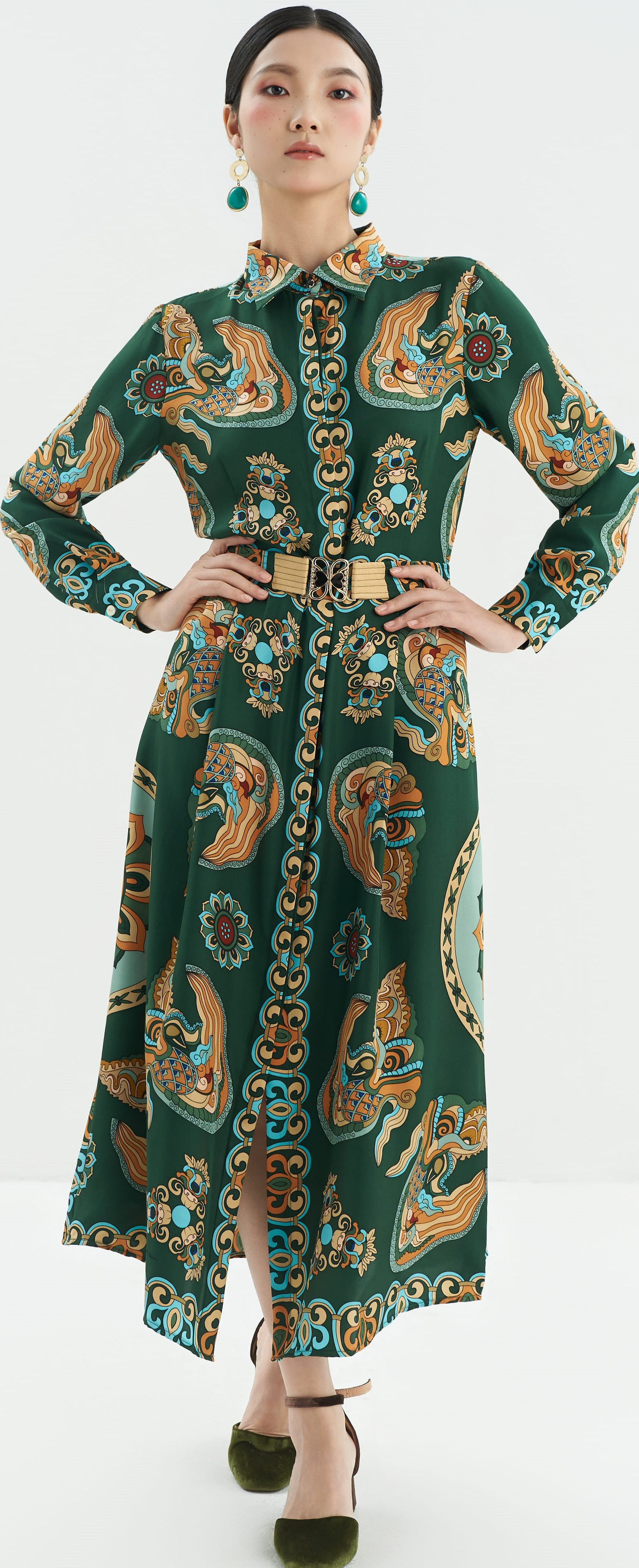 Váy Amber được may từ 5 chiếc khăn lụa tơ tằm cao cấp, với mỗi họa tiết được ghép đối xứng, hài hòa một cách độc đáo, tạo nên một bức tranh đương đại đầy ấn tượng và duy nhất. Thiết kế dáng váy sơ mi nhẹ nhàng, thanh thoát với cổ đức classic và tay dài thanh lịch, kết hợp cùng phần đai thắt eo giúp tôn lên đường nét nữ tính, duyên dáng của người mặc.